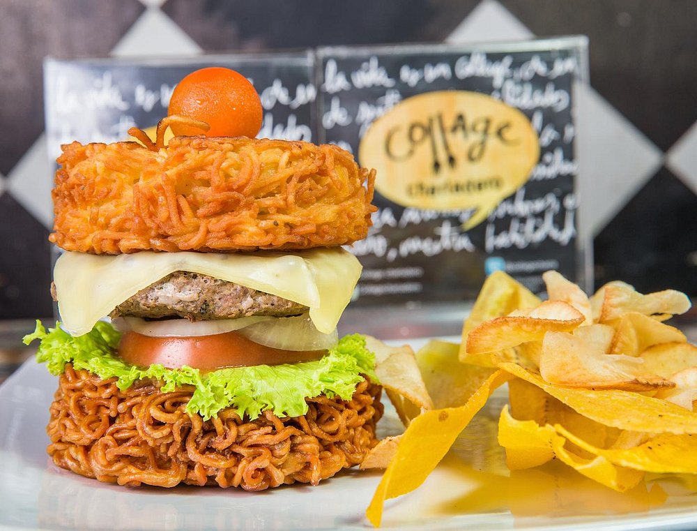 Collage is located just around the corner from the Clock Tower entrance to Cartagena’s old town and is basically hipster heaven. The place is filled with recycled material DIY projects like the collaged table tops and chairs and the empty wine bottle drink menus. They are even up to date on the latest food trends with a ramen burger which we thought would never make it to Cartagena.